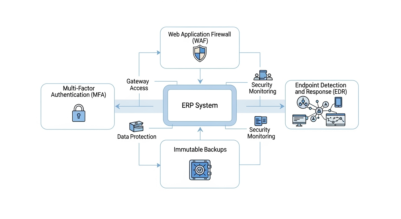 - Segmentación de red y least privilege para ERP, integraciones y bases de datos.