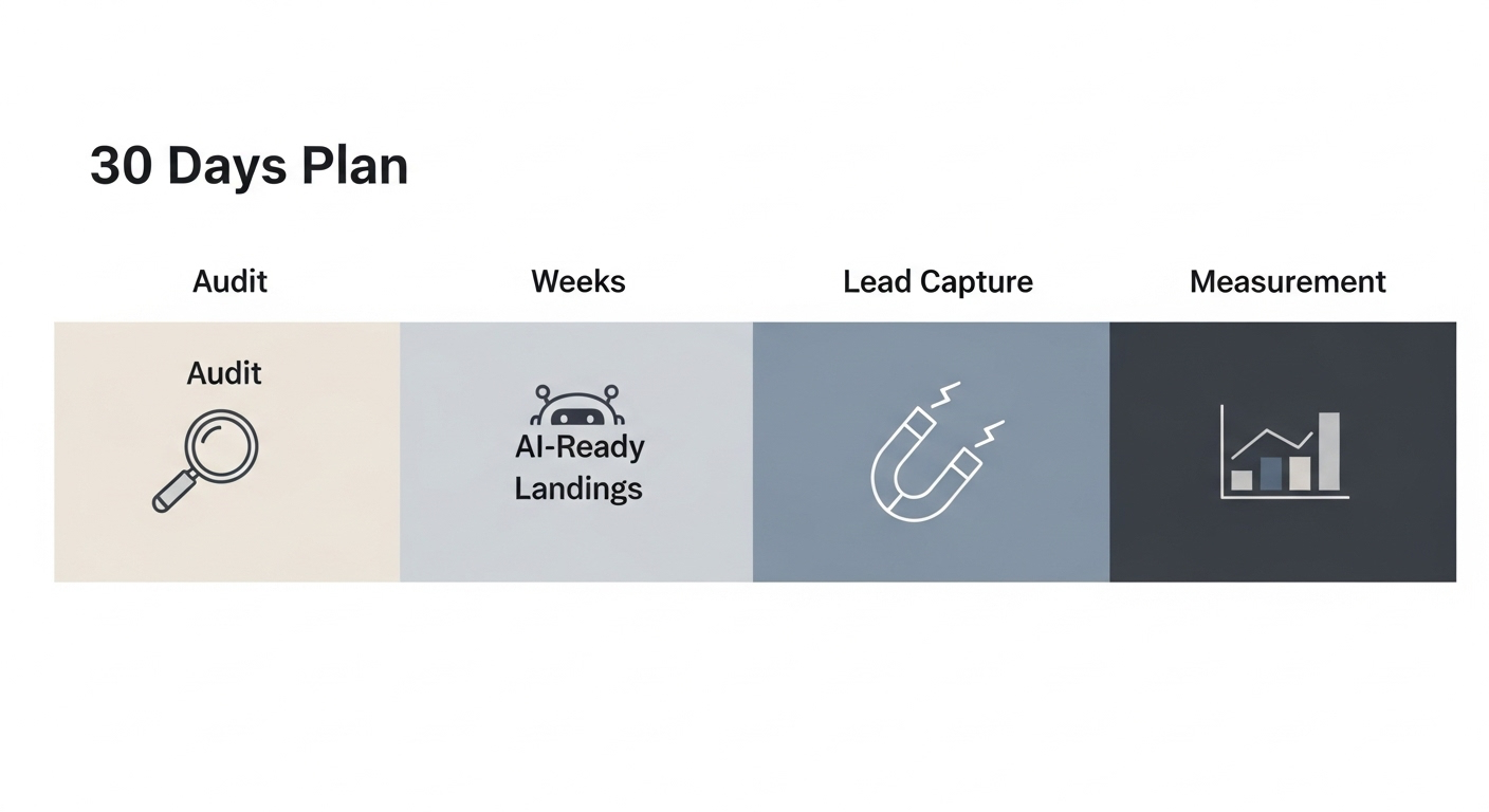 Semana 1: Auditoría de intención, 10 FAQs prioritarias, schema base, 3 snippets IA-ready.
