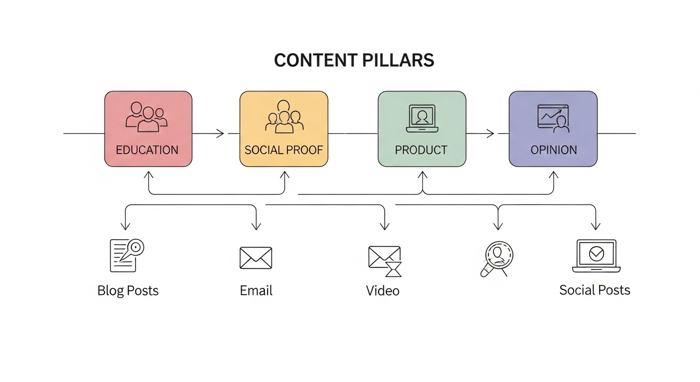 - Ángulos de contenido: educativo, prueba social, producto, opinión/benchmark.