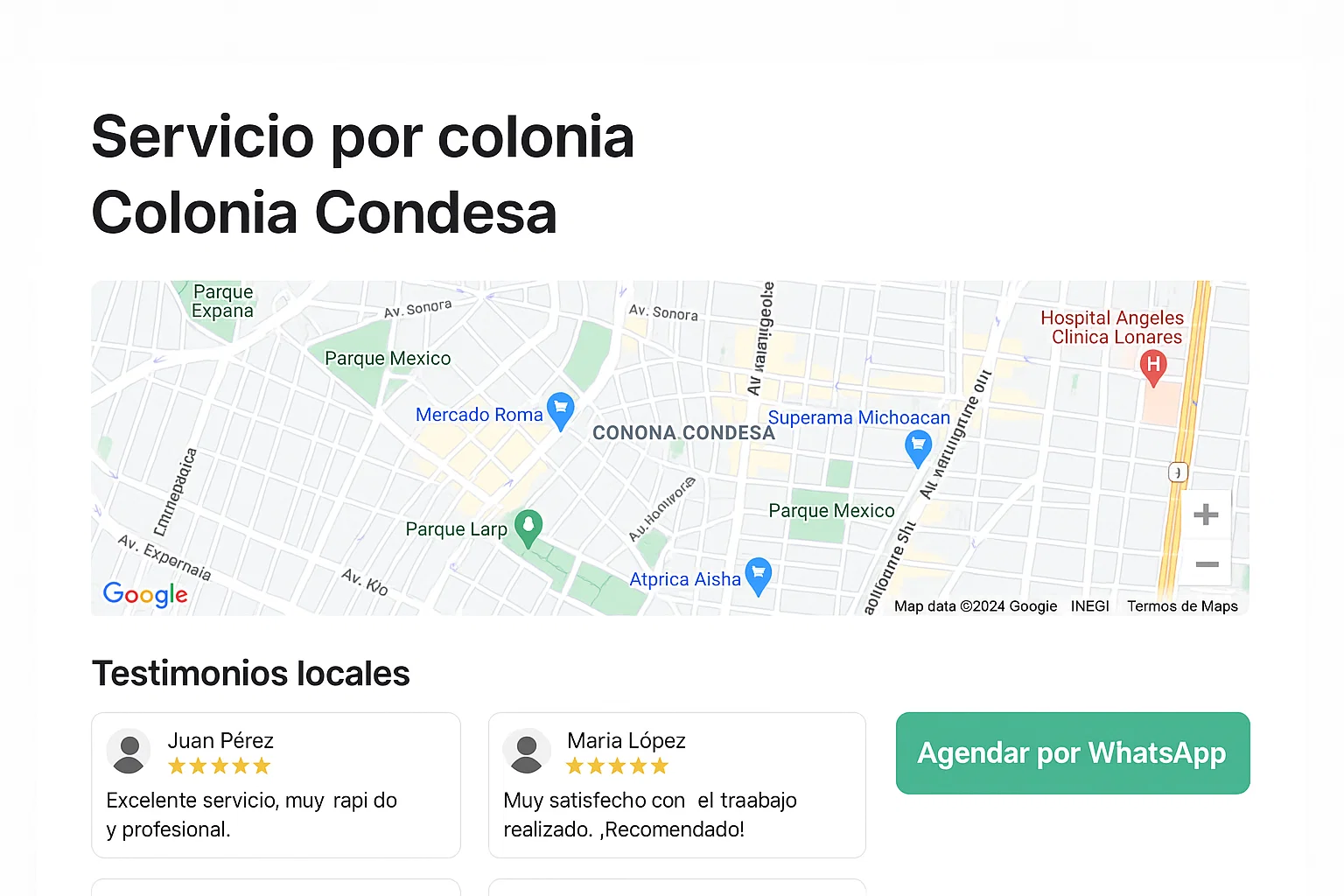 - H1 específico con el servicio y la colonia; CTA visible “Agendar/WhatsApp”.